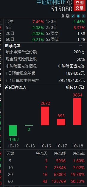 2024年6月27日,中证红利ETF(515080.SH)收跌0.39%,成交1.99亿元。净流入7267.20万元(净申购份额*单位净值),居可比基金首位。