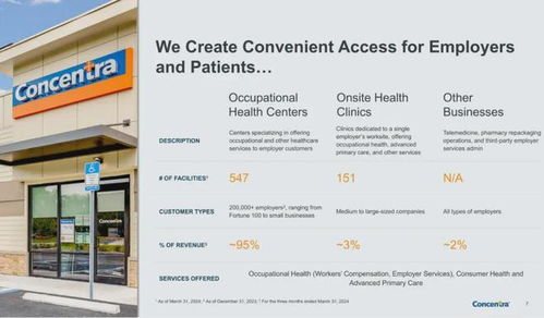 据介绍,Concentra在美国41个州经营着547个独立的职业健康中心,在37个州的雇主工作场所经营着151个现场健康诊所。