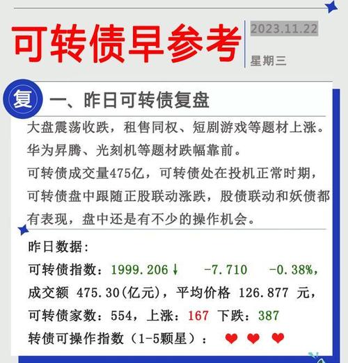 2. 市场行情:股票可转债的价格会受到市场供求关系、债券评级、利率等多个因素的影响。在交易前,你应该注意市场行情,并根据自己的需求和风险承受能力做出决策。